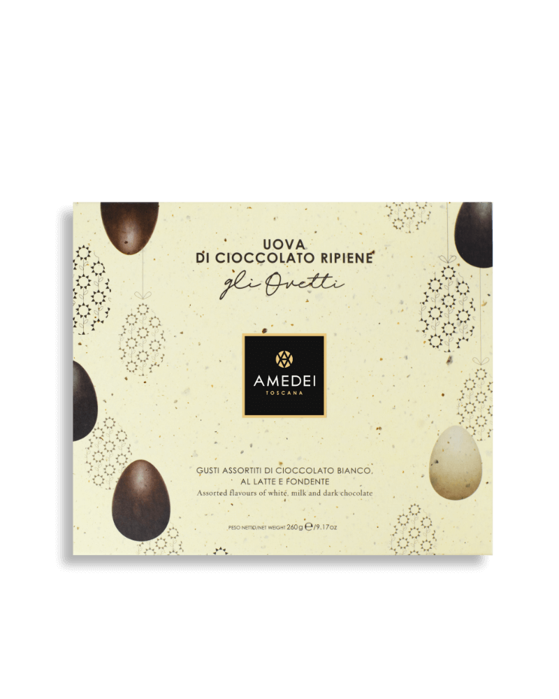 A chi desidera un tocco di dolcezza in ogni momento Amedei propone la nuova linea "Gli Ovetti". Una irresistibile piccola coccola. Golosi ovetti di cioccolato ripieni in 3 diversi gusti da concedersi o da condividere con le persone care: Il Fondente - un guscio di cioccolato fondente al 66% ripieno di cioccolato al gusto mandorla; Il Bianco - un guscio di cioccolato bianco ripieno di cioccolato al gusto nocciola; Il Latte - un guscio di cioccolato al latte ripieno di cioccolato gianduja.
