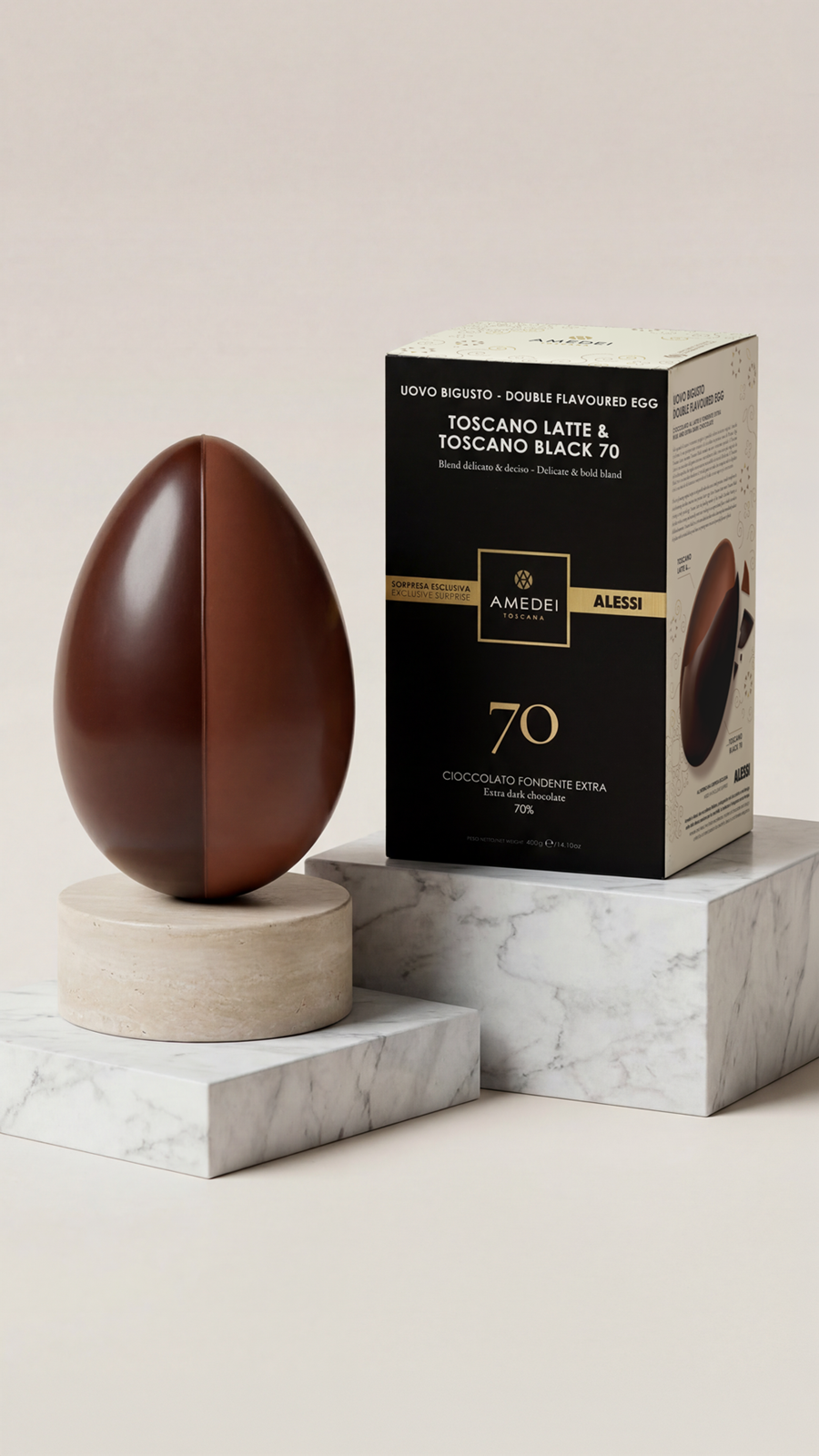 Qui Toscano latte incontra Toscano Black creando un uovo veramente speciale: un cioccolato al latte dal guscio cremoso e naturalmente dolce e un cioccolato fondente al 70% dal gusto rotondo.