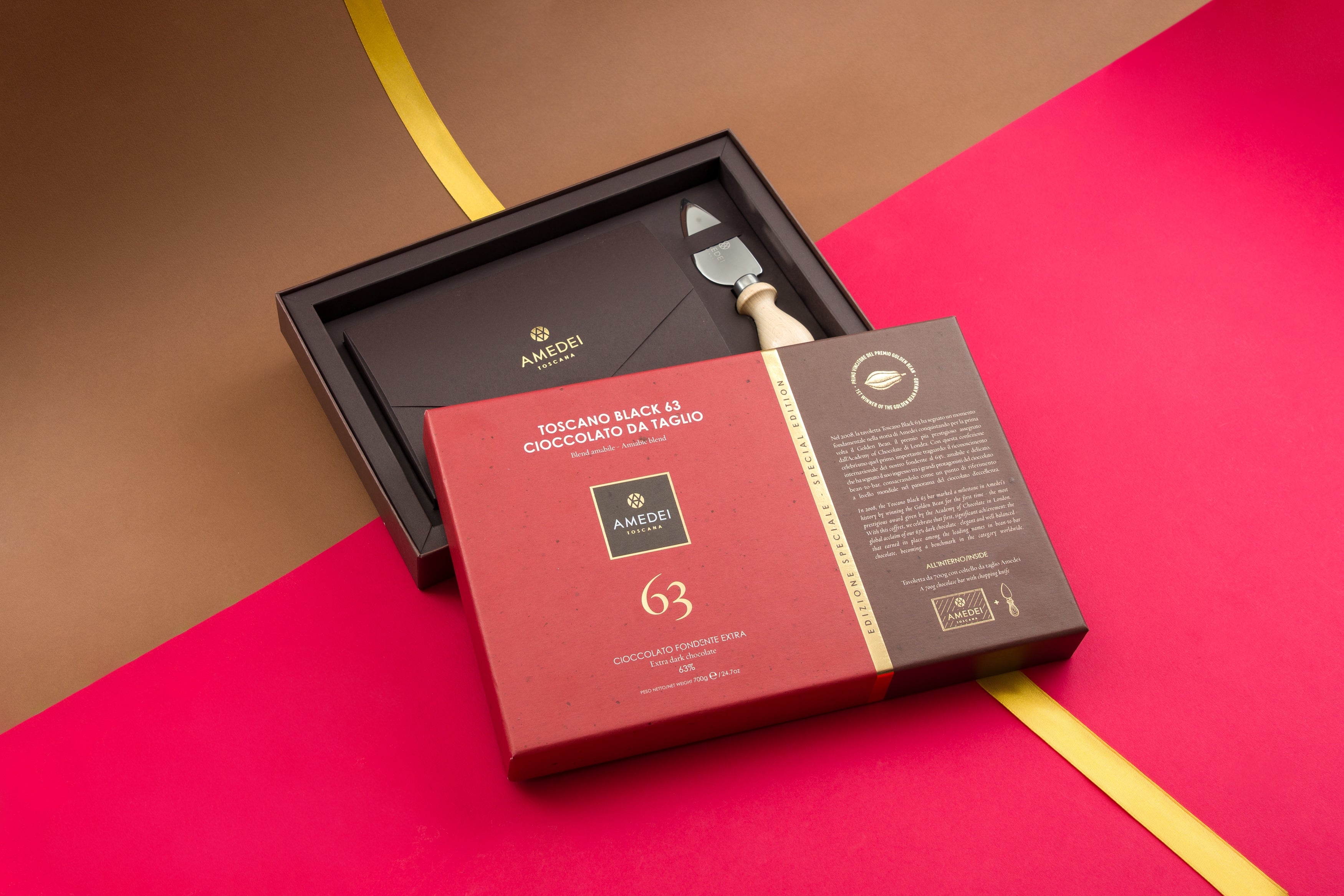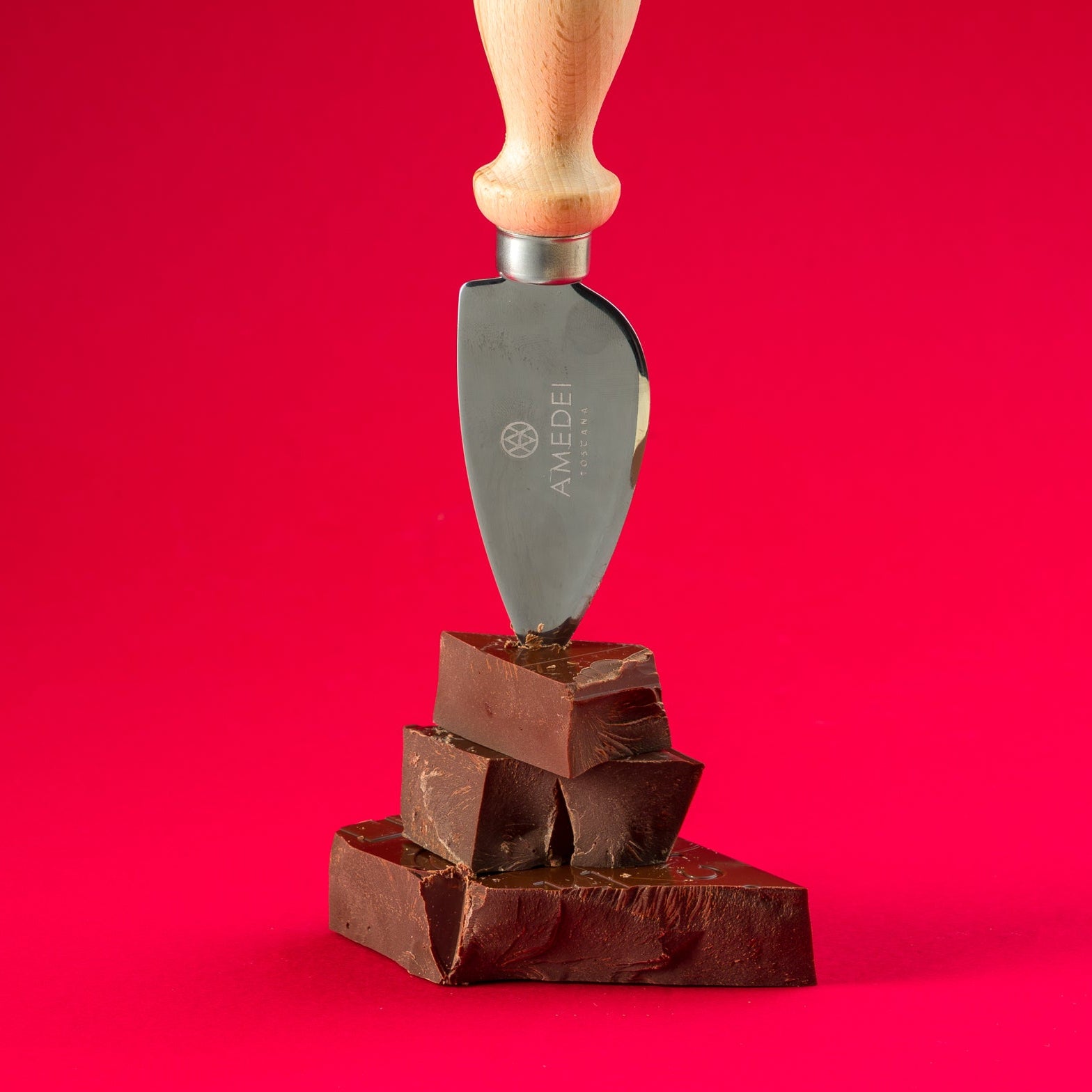 La confezione include un raffinato coltello da taglio Amedei, pensato