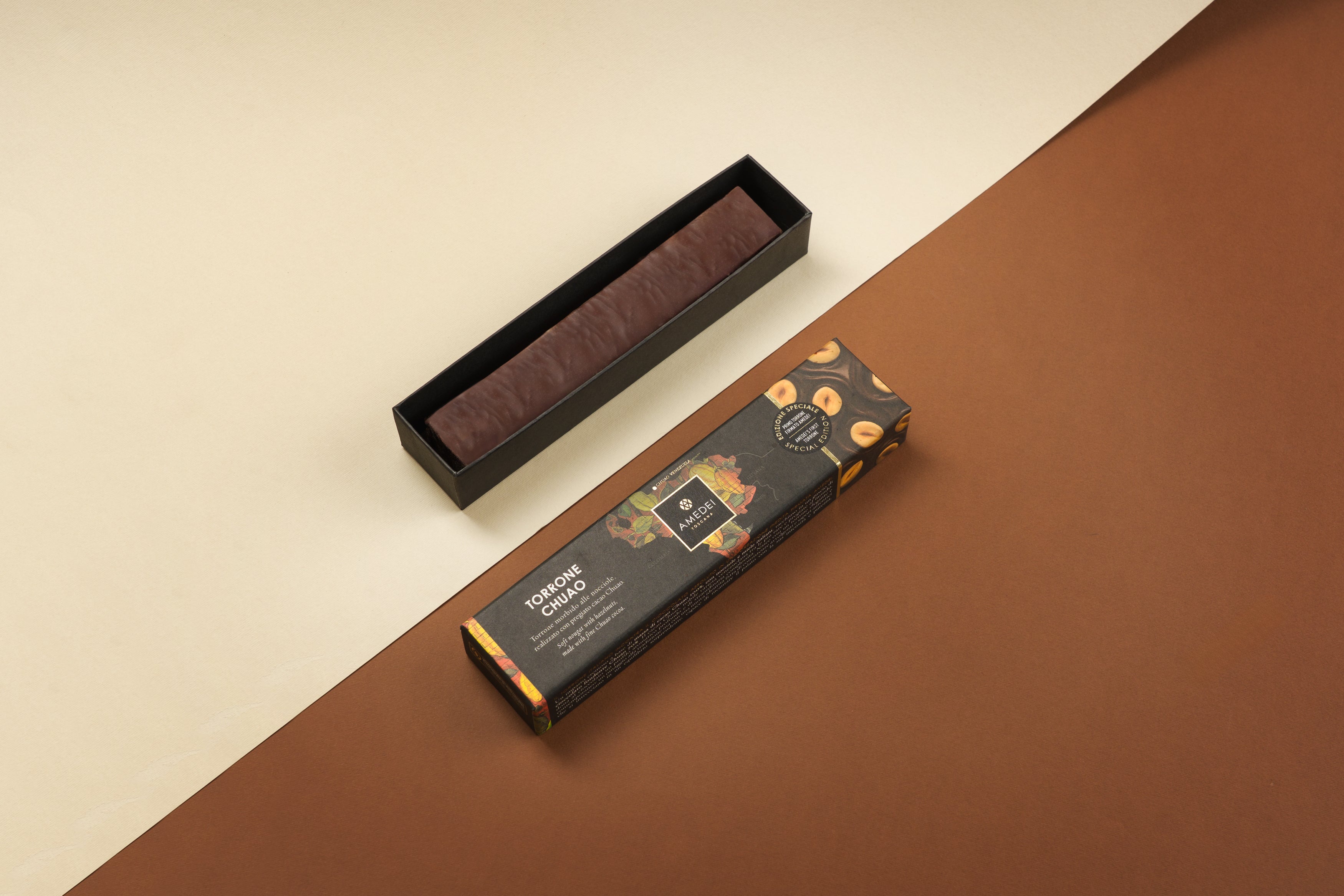 Per la prima volta, Amedei firma una creazione inedita che unisce tradizione ed eccellenza in un’armonia di sapori sorprendente e irresistibile. Un impasto cremoso e avvolgente, ottenuto dalla combinazione di nocciole e miele italiani con la pura massa di cacao Chuao 100%, racchiuso in un generoso strato di cioccolato fondente Chuao 70%.