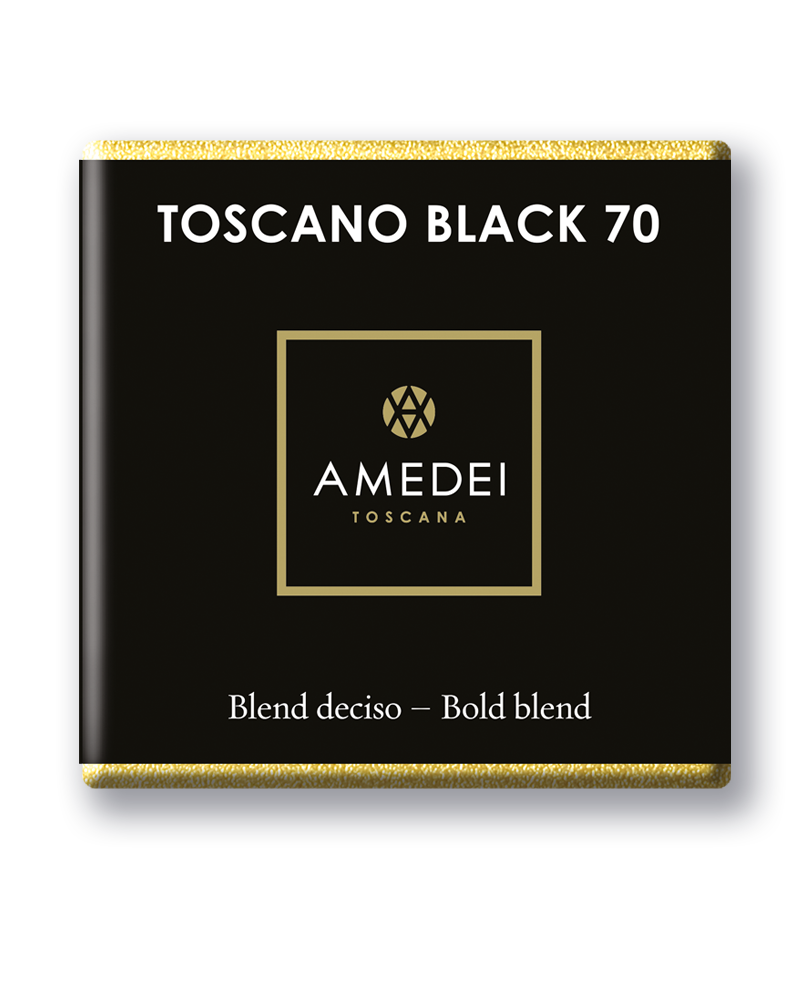 Toscano Black 70 is the first creation (1998) and Casa Amedei's dark chocolates Manifesto. It is a bold blend, obtained by combining three genetic qualities of cocoa from Madagascar, Ghana, Ecuador and Venezuela. A 70% dark chocolate with a clean snap that immediately seduces the palate with its initial delicacy and then a surprising more structured powerful flavour to finish