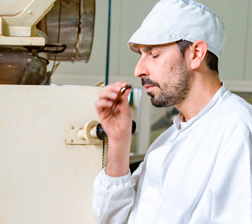 Luca, Chocolate Maker at Amedei, supervises every phase of the manufacturing process, that relies on years of craftsmanship and knowledge of the world of cocoa.