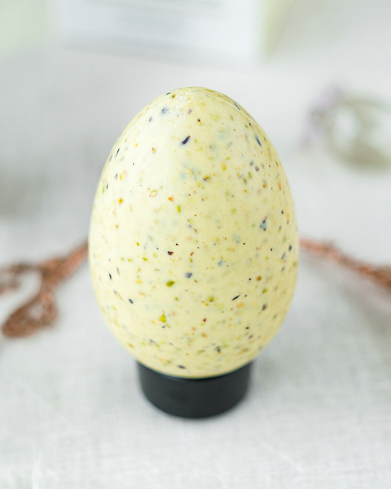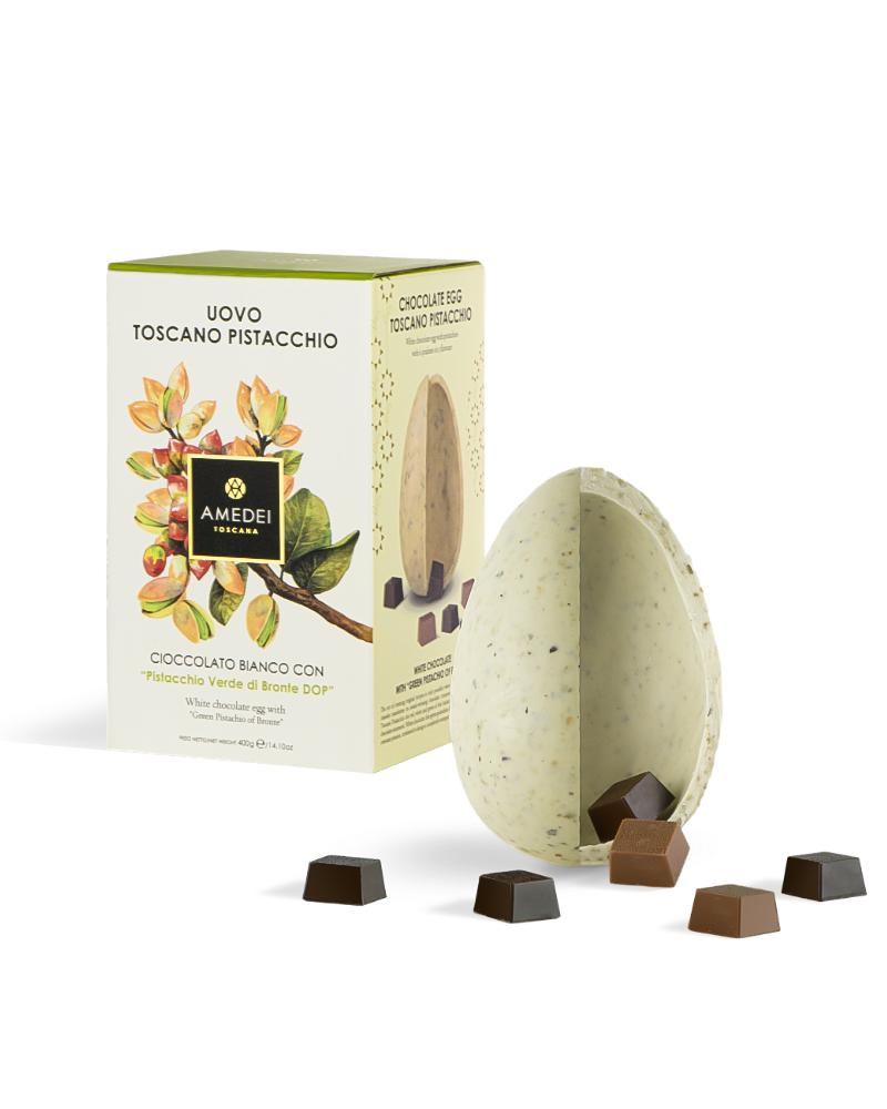 An Italian flagship, carrying the experience in making white chocolate. White chocolate, green, superb pistachios of Bronte and red passion combining in designing an unsettling flavor that evolves as the fruit ripens in the chocolate, in a crescendo of deliciousness.